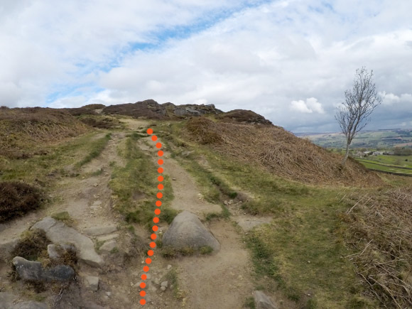 Once passed the “calf” there are many little paths created by previous footsteps wondering around the rocks. Keep following the route away from the rocks and aim for the path that is higher up. You can see it leading away in the distance.